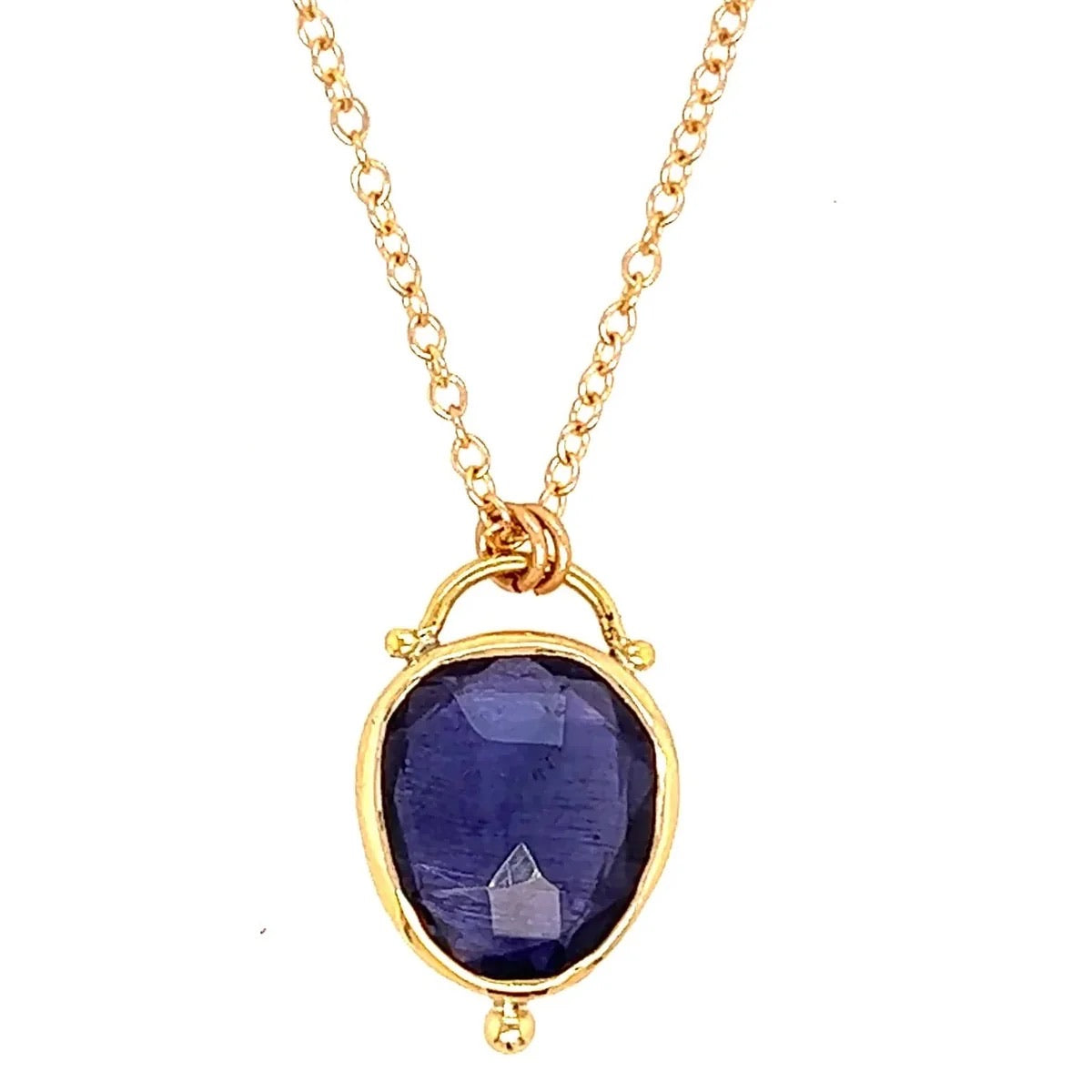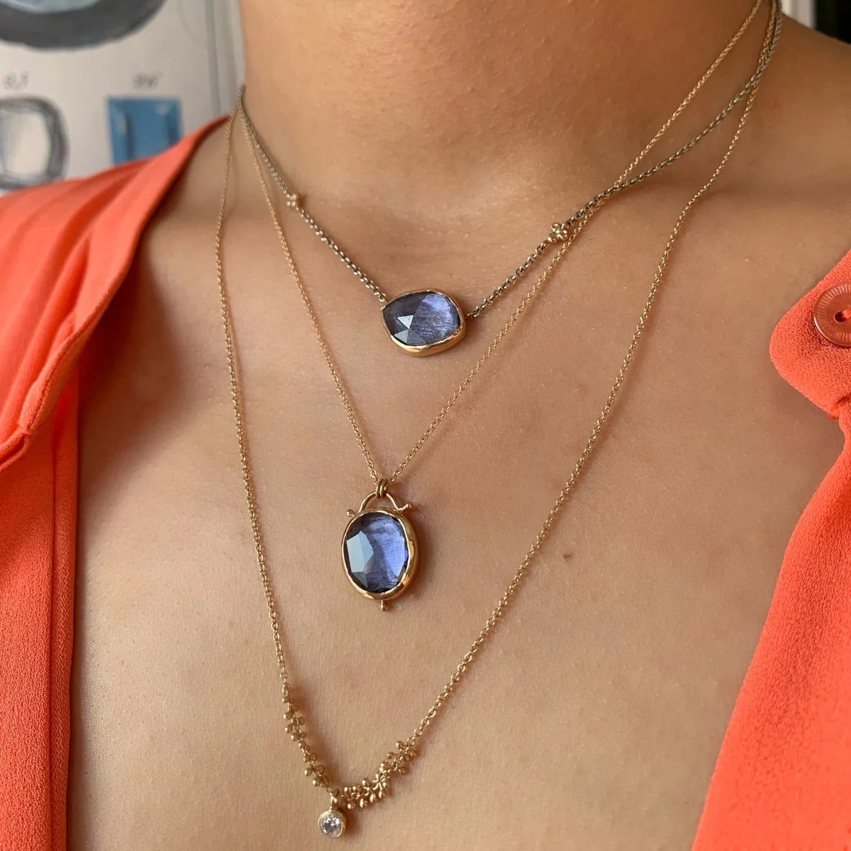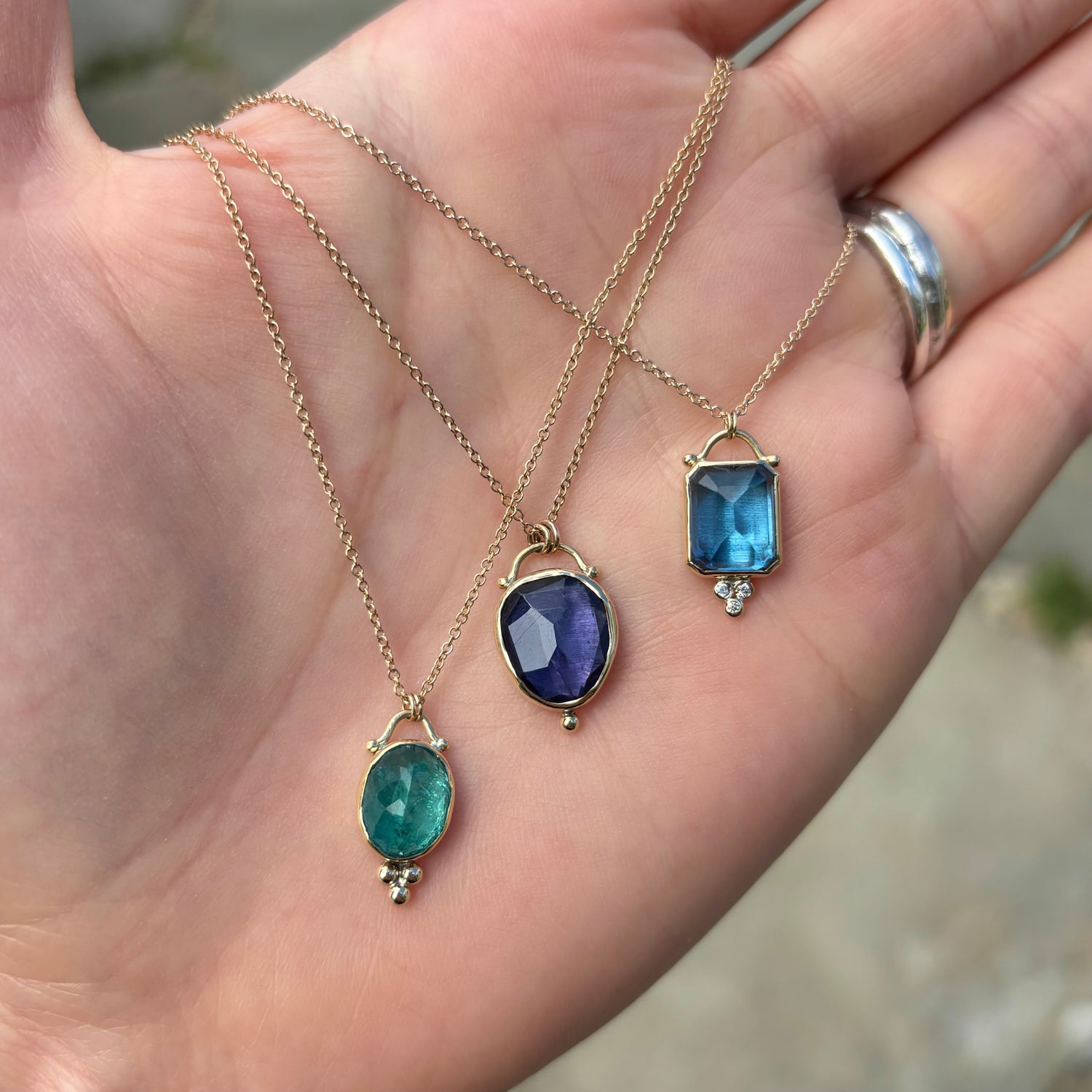 This stunning Iolite necklace has a gorgeous blue-purple hue that seems to glow on the skin. Set in 14K yellow gold with lovely handmade accents, it is suspended from a 17" 14K cable chain. Handmade by Emily Amey in Hudson Valley, NY.