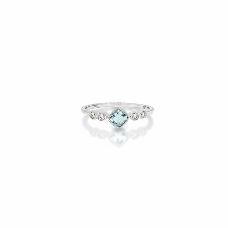 This 14k white gold ring features a petite cushion cut aquamarine gemstone flanked by two small natural diamonds on each side. There is a subtle beaded edge around the stones.