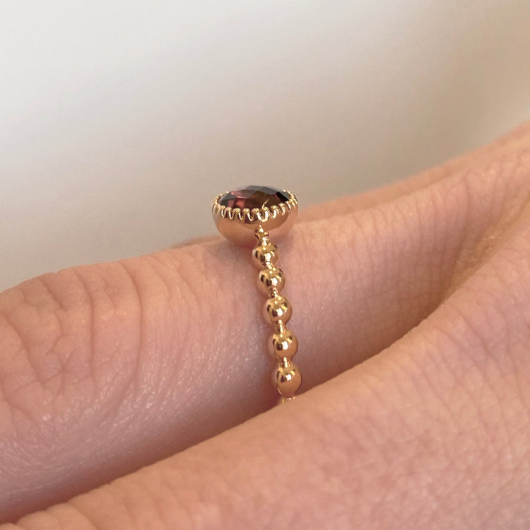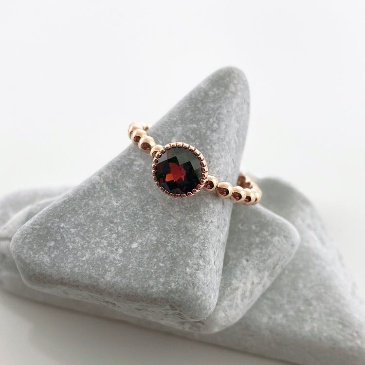 This 14k rose gold ring features a round checkerboard cut 1.14 ct garnet set low in a beaded bezel setting. The band is beaded almost entirely for added detail.