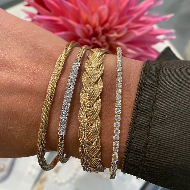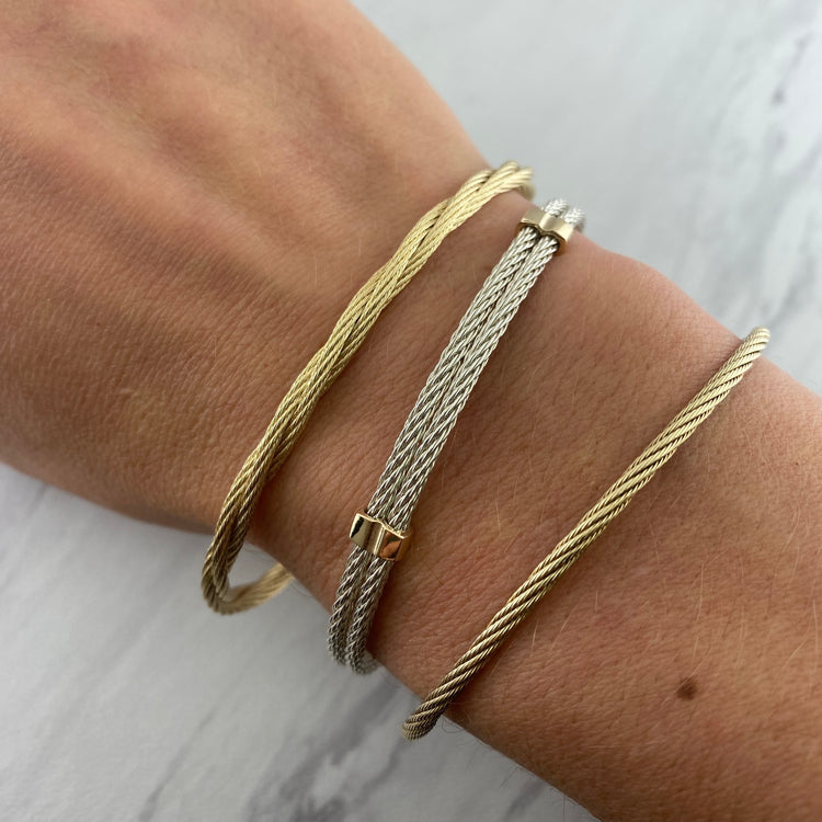 Handcrafted and hand twisted in 14K gold, this nautical style bracelet featured three twisted cables, each measuring 1.8 mm thick. This bracelet features a lobster clasp.
