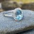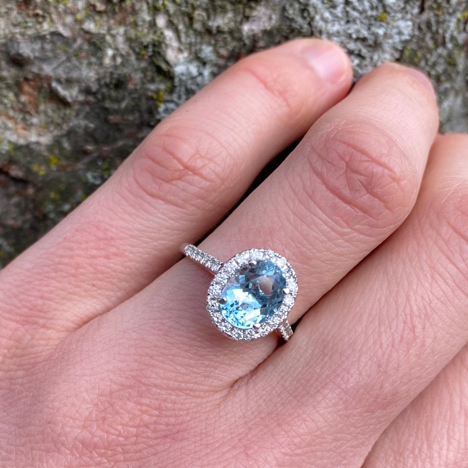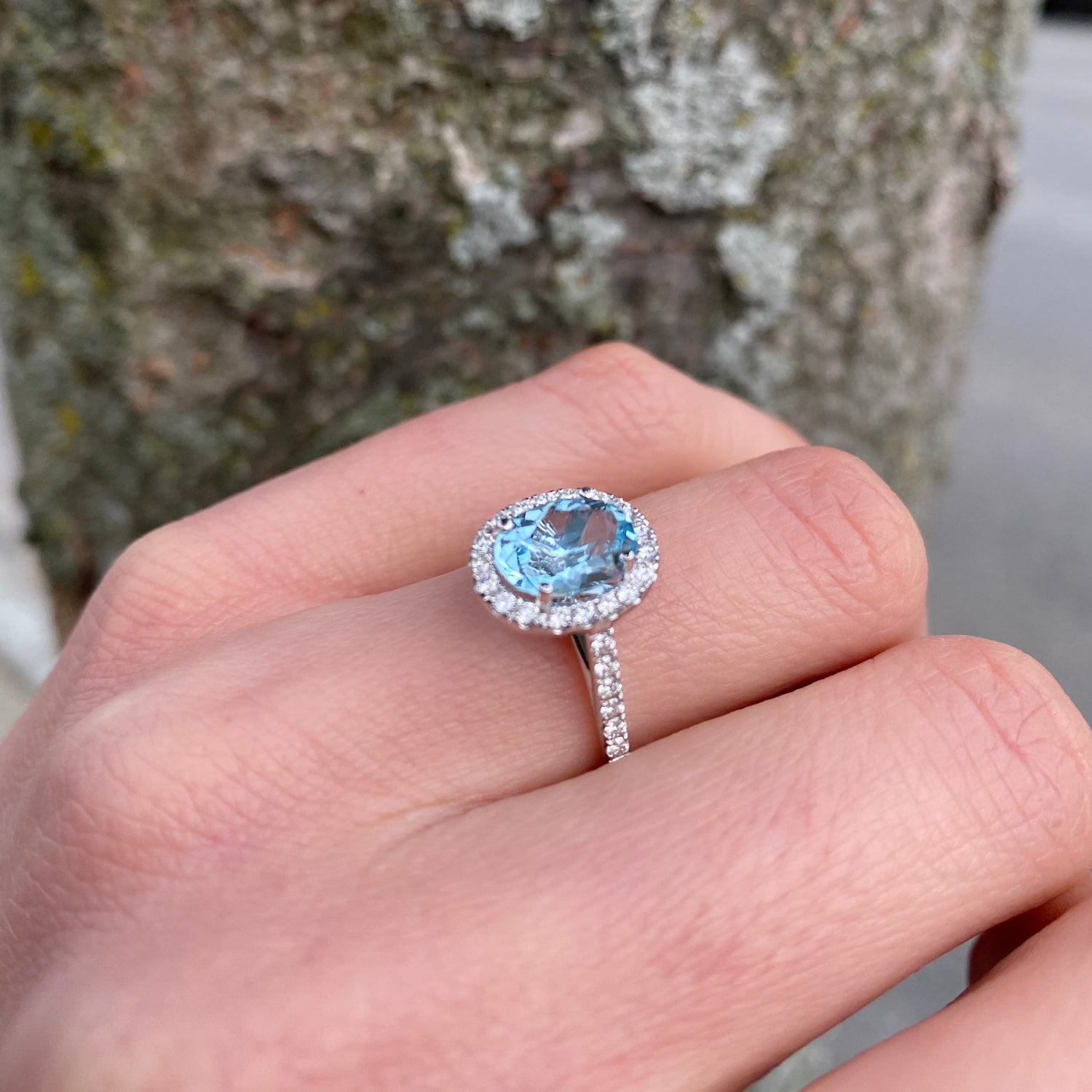 This elegant and special ring features a sparkling oval aquamarine stone of superior quality and gorgeous color.  Aquamarine weighs 1.53 carats and is surrounded by a halo of diamonds, that continue down the band for added sparkle.  Total diamond weight is 0.28 ct. Mounting is 14k white gold.  Size 7.  Sizing available upon request.