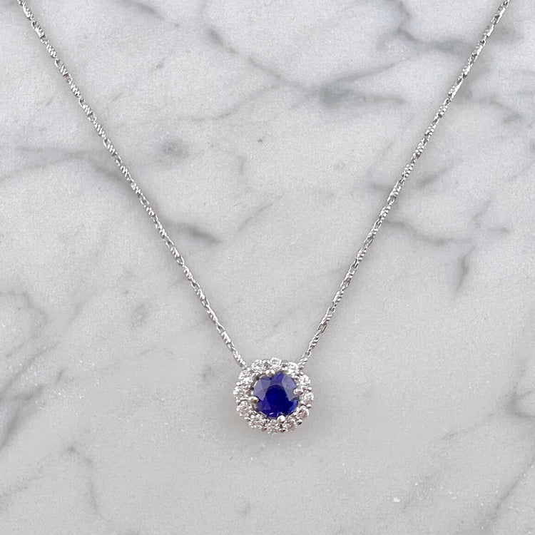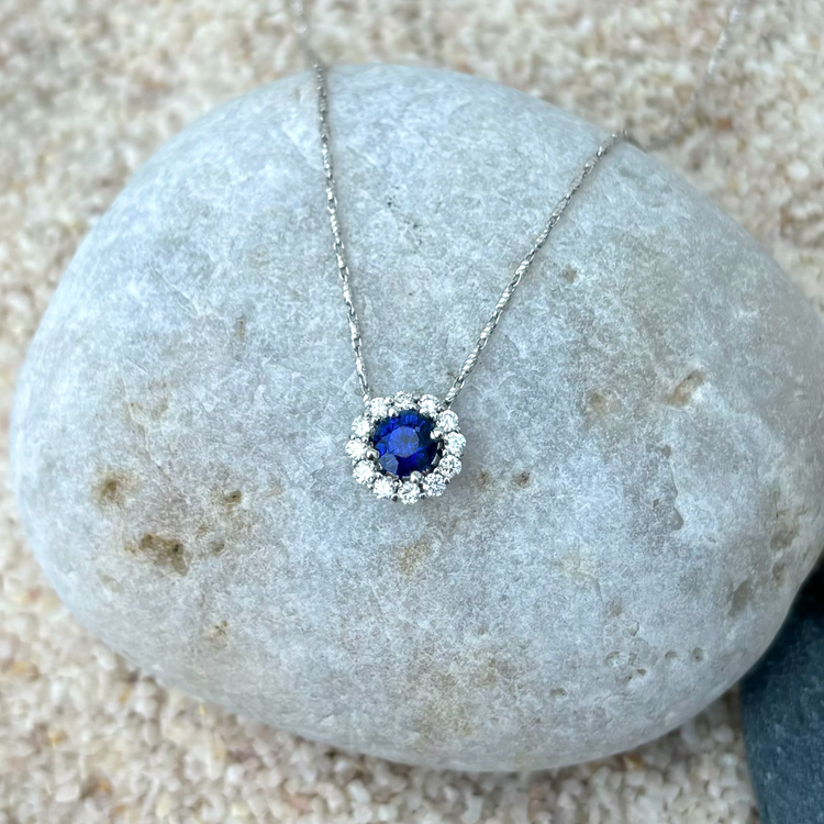 This vibrant blue sapphire is surrounded by a halo of .25 carats of diamonds and is set in 14k white gold. The sapphire is rich in color and shines beautifully alongside the diamonds. The pendant comes on an 16" 14k white gold chain.