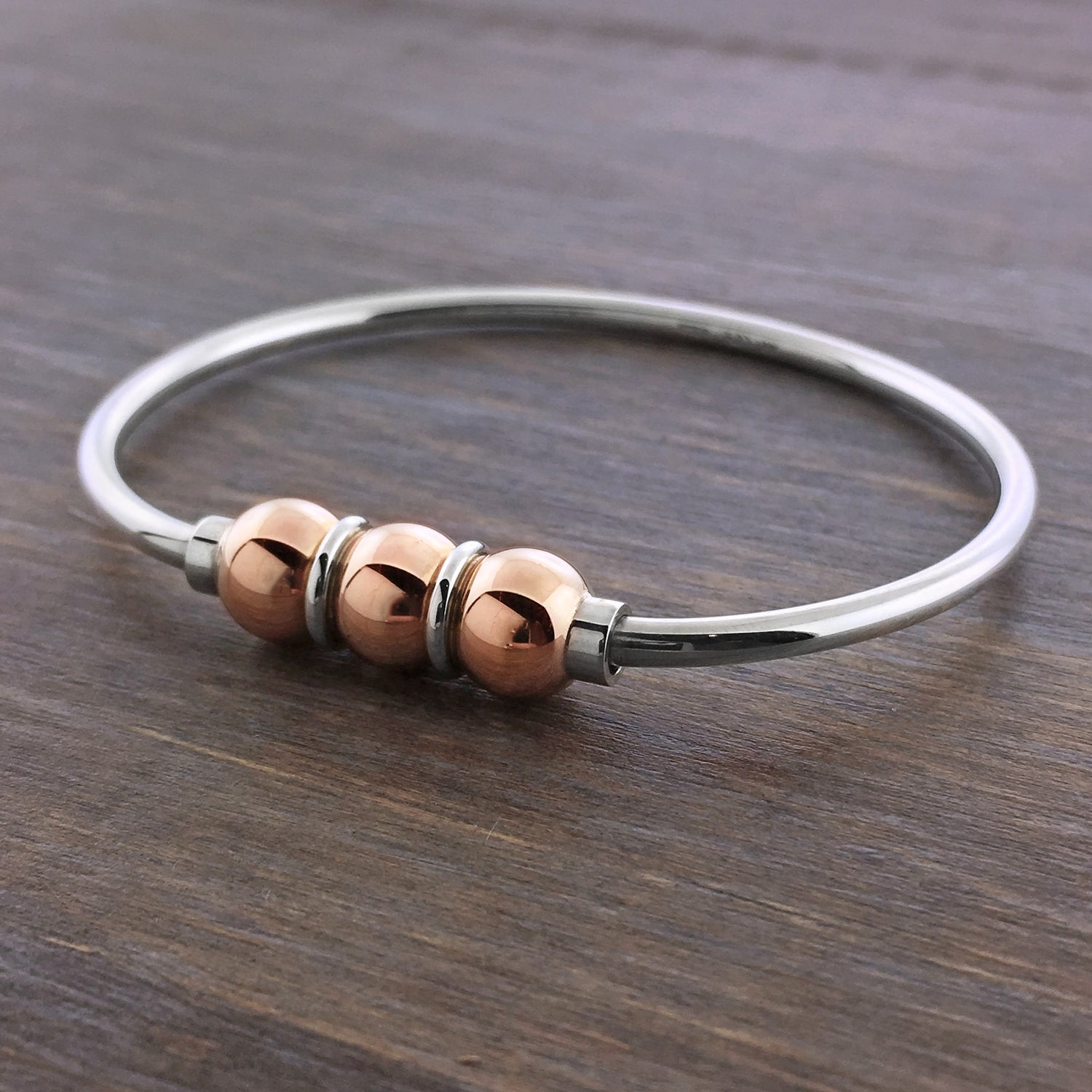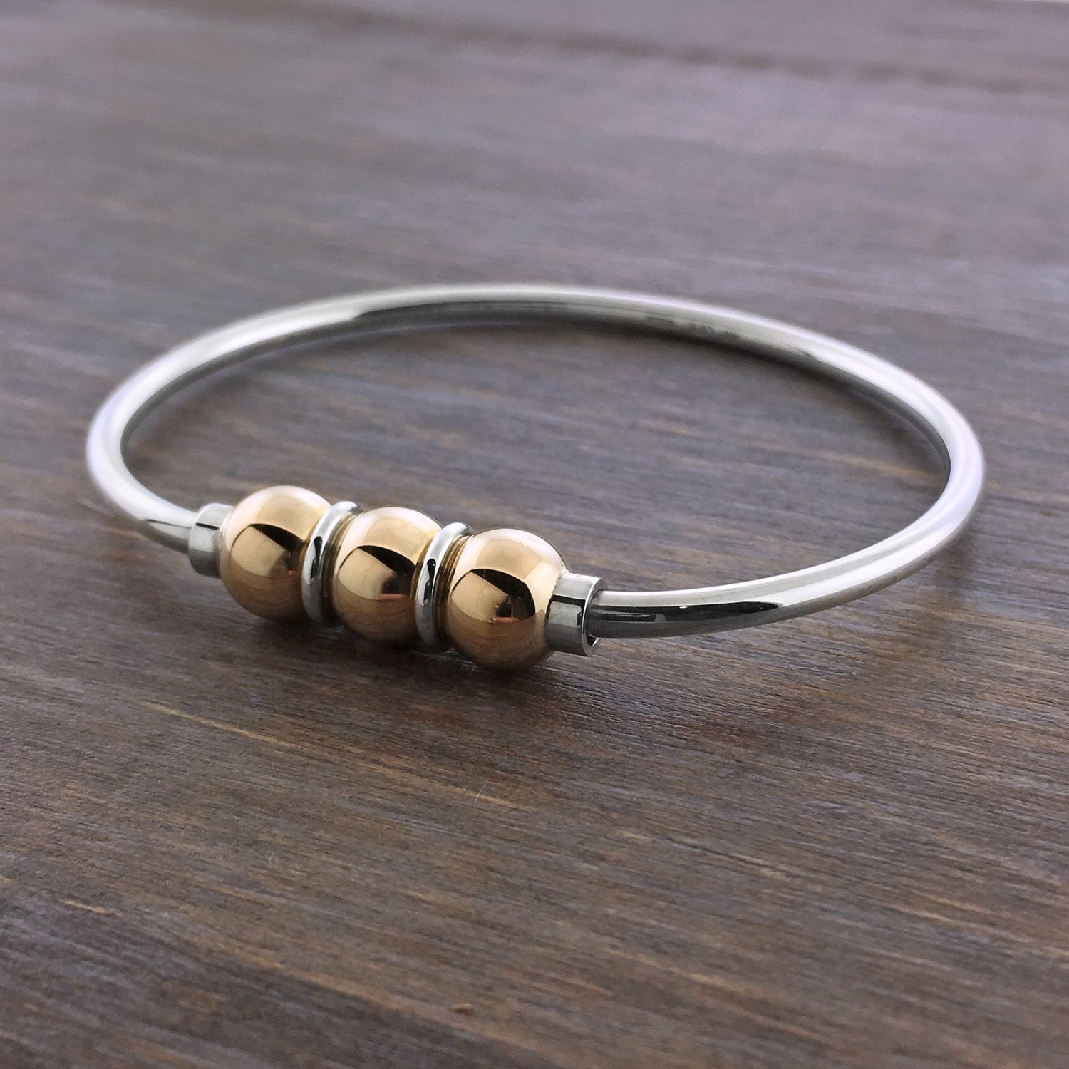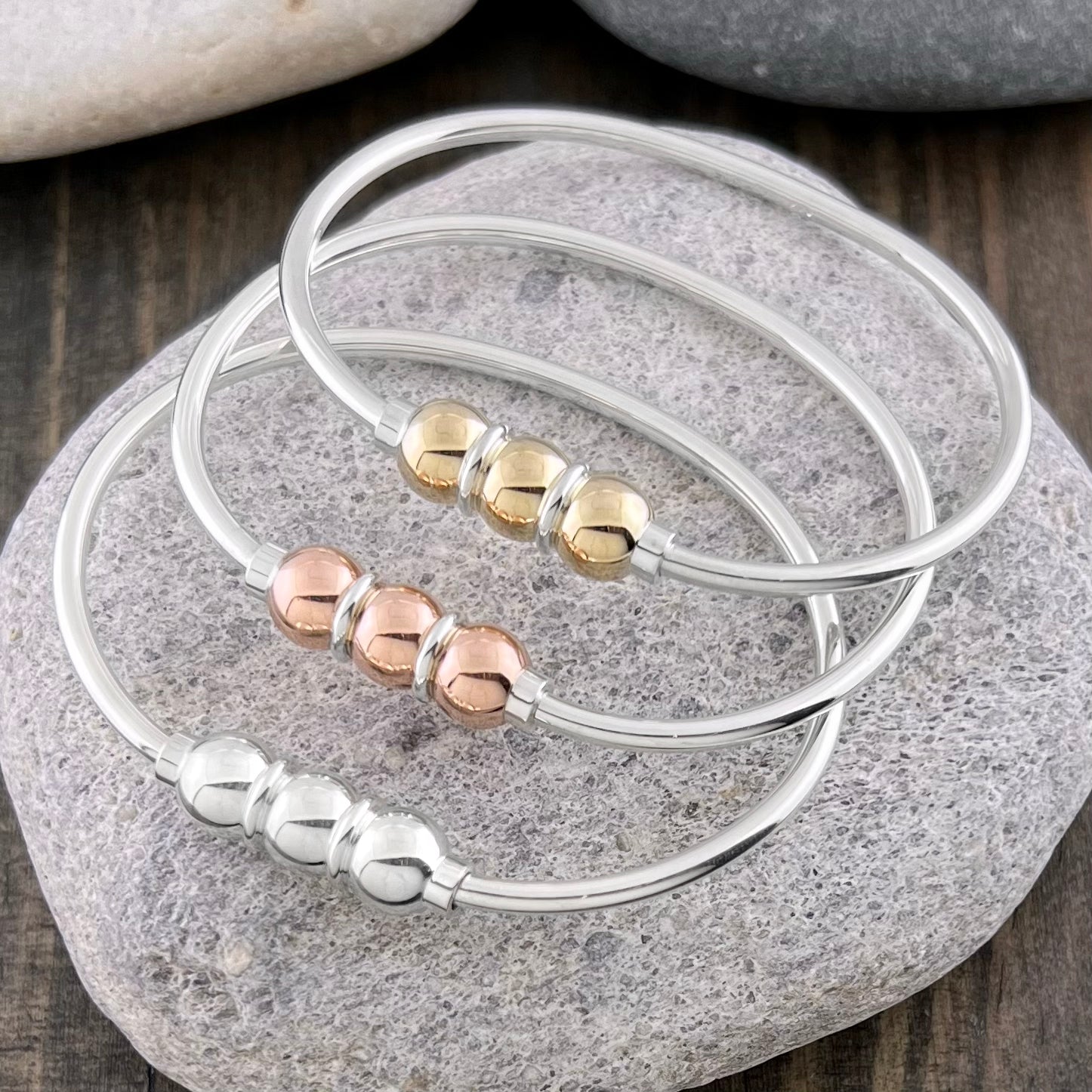 This bracelet is a beautiful statement piece, with three beads lined across the top. The three ball bracelet is often worn to symbolize three children, a 3rd anniversary, or another special meaning to the wearer. It is available in All Sterling Silver or solid 14k Yellow or Rose Gold + Sterling Silver.