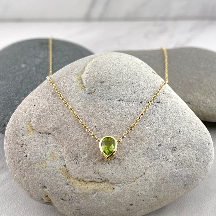 A stunning .72 ct inverted teardrop shaped peridot is bezel set in 14k yellow gold. The necklace measures 16-18" in length.