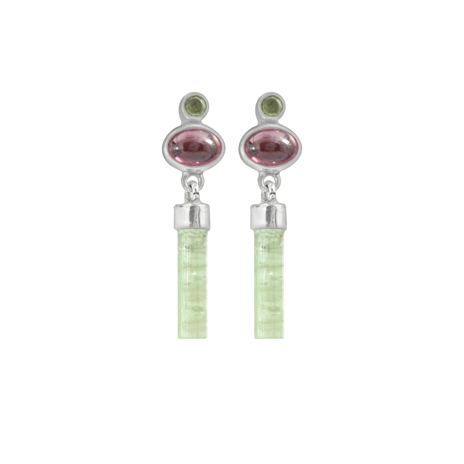 Designed by Misti Martin, these pink and green tourmalines to create a fun drop earring set in sterling silver with a post back.