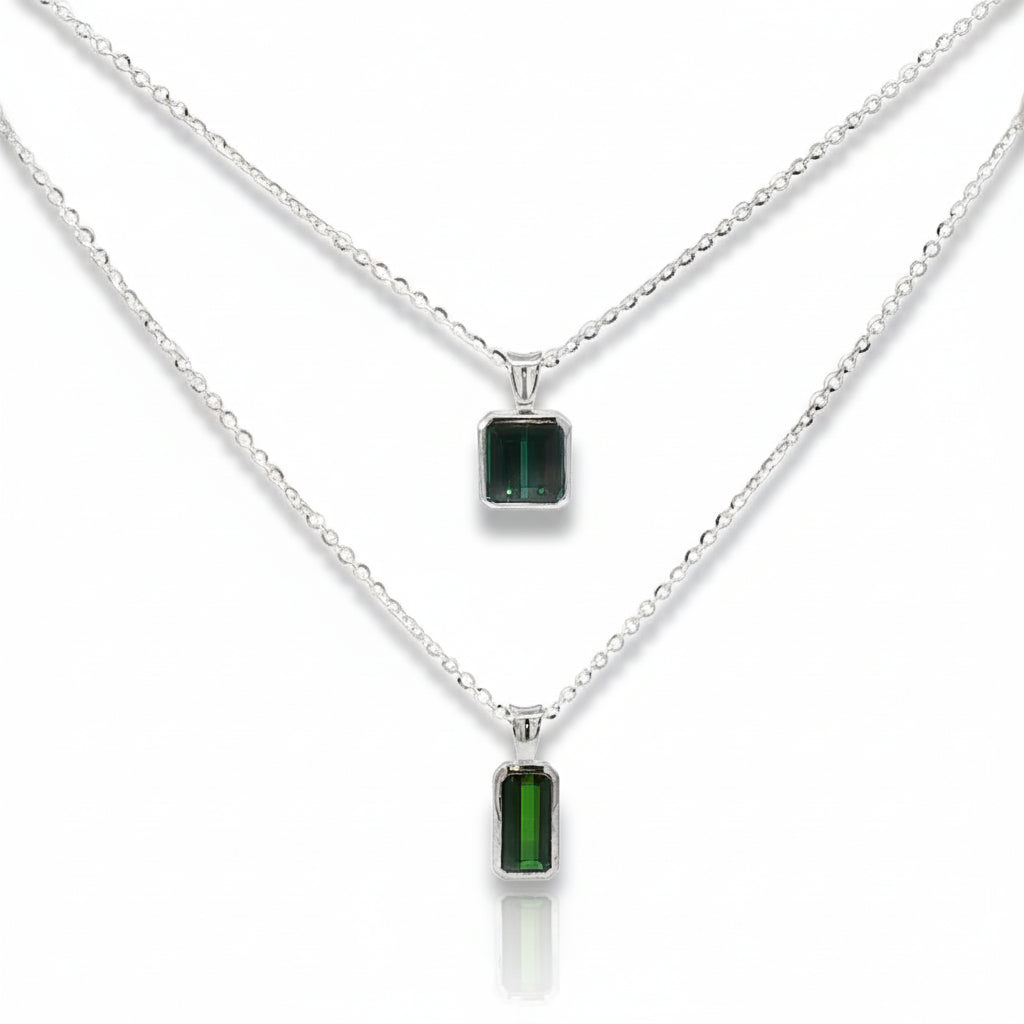 Choose between two stunning Tourmaline pendants: a square emerald cut stone in deep green with a touch of teal, weighing 2.2 carats, or a rectangular emerald cut rich olive green stone weighing 1.13 carats. Each gem is bezel-set in sterling silver and hangs from an 18" cable chain.