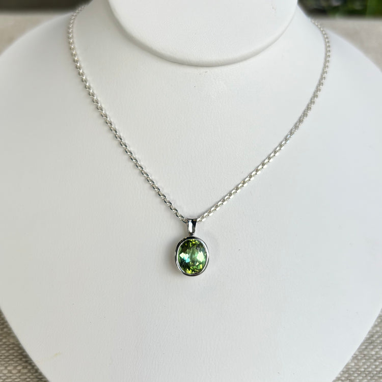 Vibrant Green Tourmaline sparkles in these simple and elegant bezel set pendants. Each stone is a very high quality tourmaline, both with unique color. They are set in sterling silver, and come on 18" silver cable chains.
