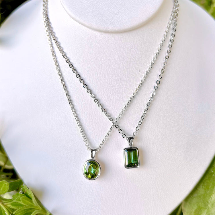 Choose from a bright 1.31 carat oval faceted Green Tourmaline, or the rectangular emerald cut, deeper Green Tourmaline at 1.50 carats.