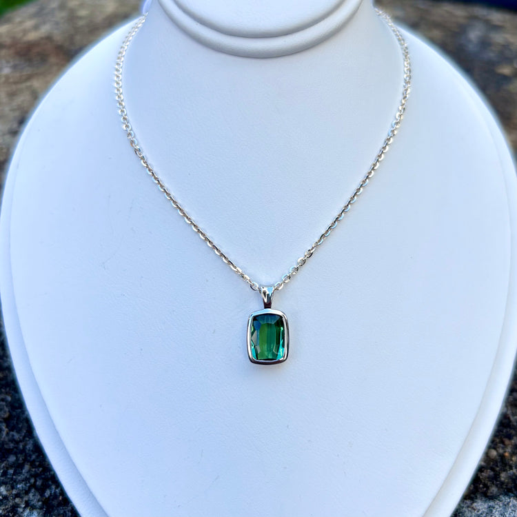 Vibrant Green Tourmaline sparkles in these simple and elegant bezel set pendants. Each stone is a very high quality tourmaline, both with unique color. They are set in sterling silver, and come on 18" silver cable chains.