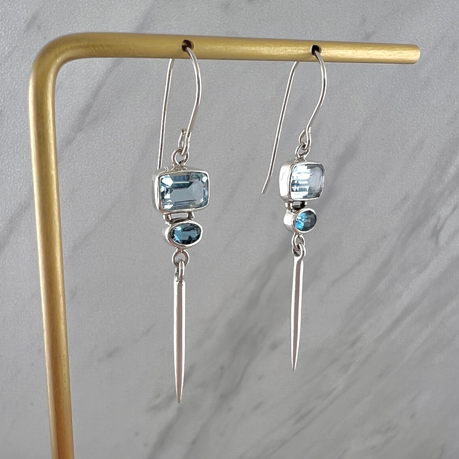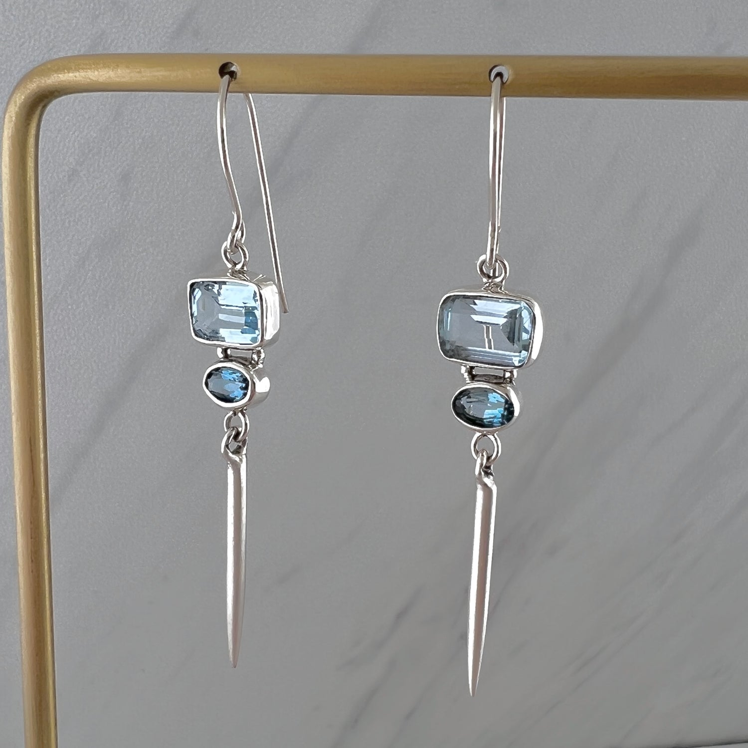 Designed by Misti Martin, these beautiful drop earrings are crafted in sterling silver and feature a sky blue topaz along with a London blue topaz.