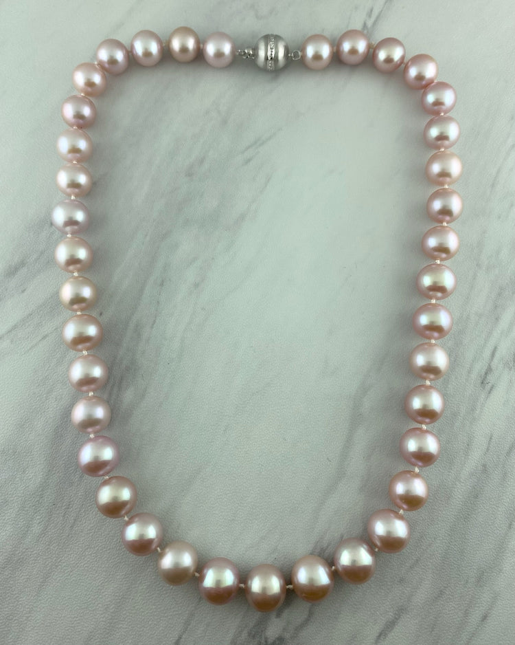 Cultured freshwater pearls 10.5-11.5mm are individually knotted on silk.  Necklace measures 18" long with 14K white gold and diamond round pearl clasp.  Can be customized to alternate lengths upon request.