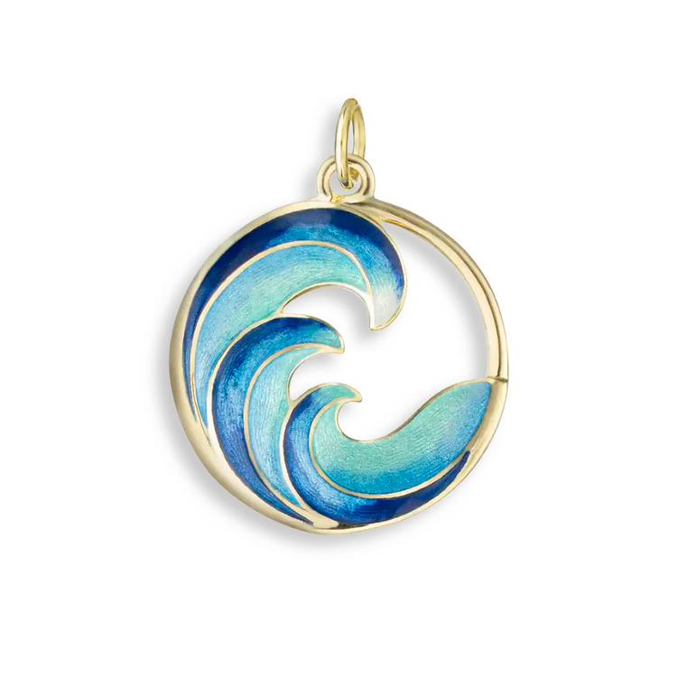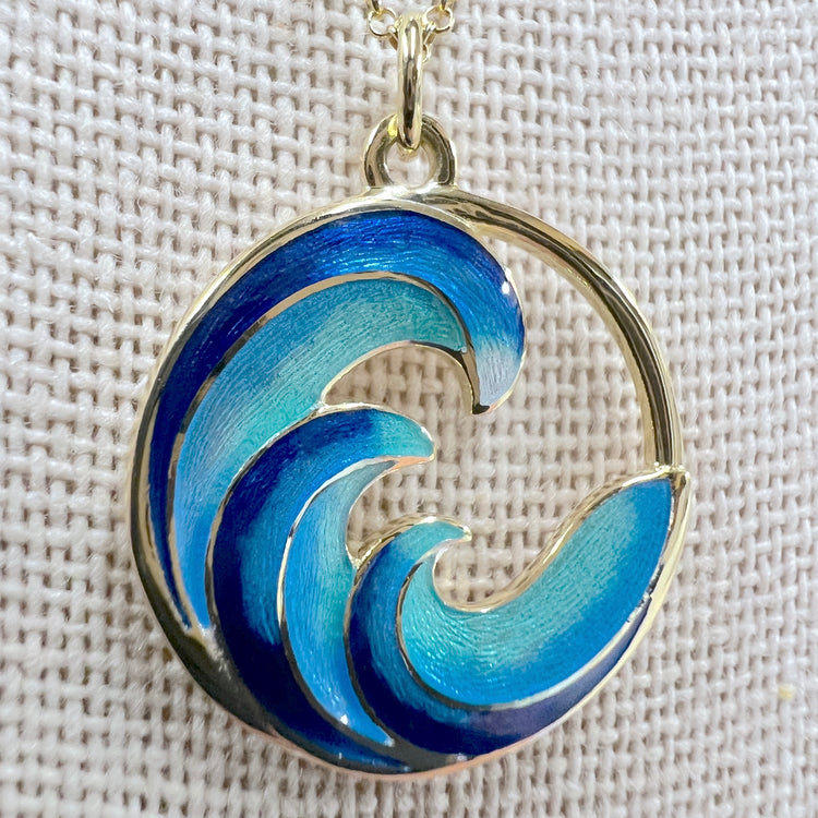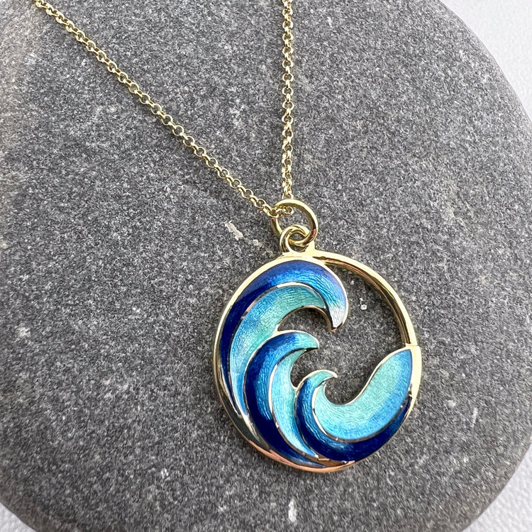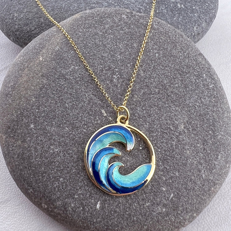 This is a stunning Turquoise Ocean Waves Necklace with Vitreous Enamel crafted in solid 18K gold. Beautiful ocean hues shine against the gold!