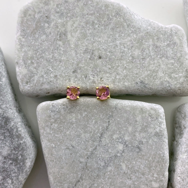 These beautiful 14k gold stud earrings feature a stunning pink tourmaline in a minimalist gold four prong setting. Pink tourmalines measure 4mm.