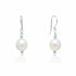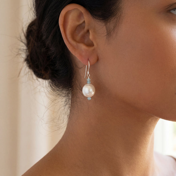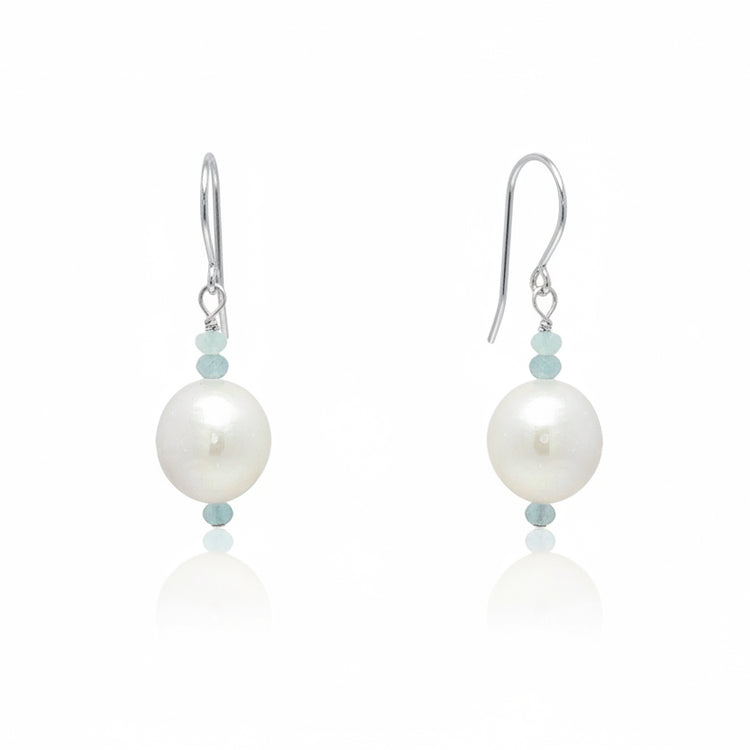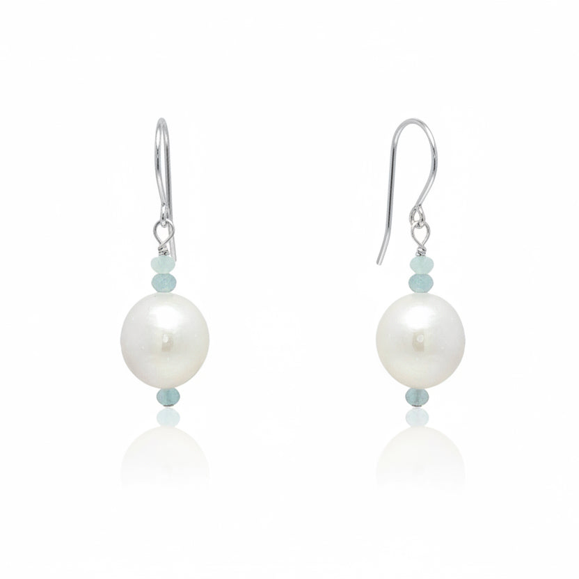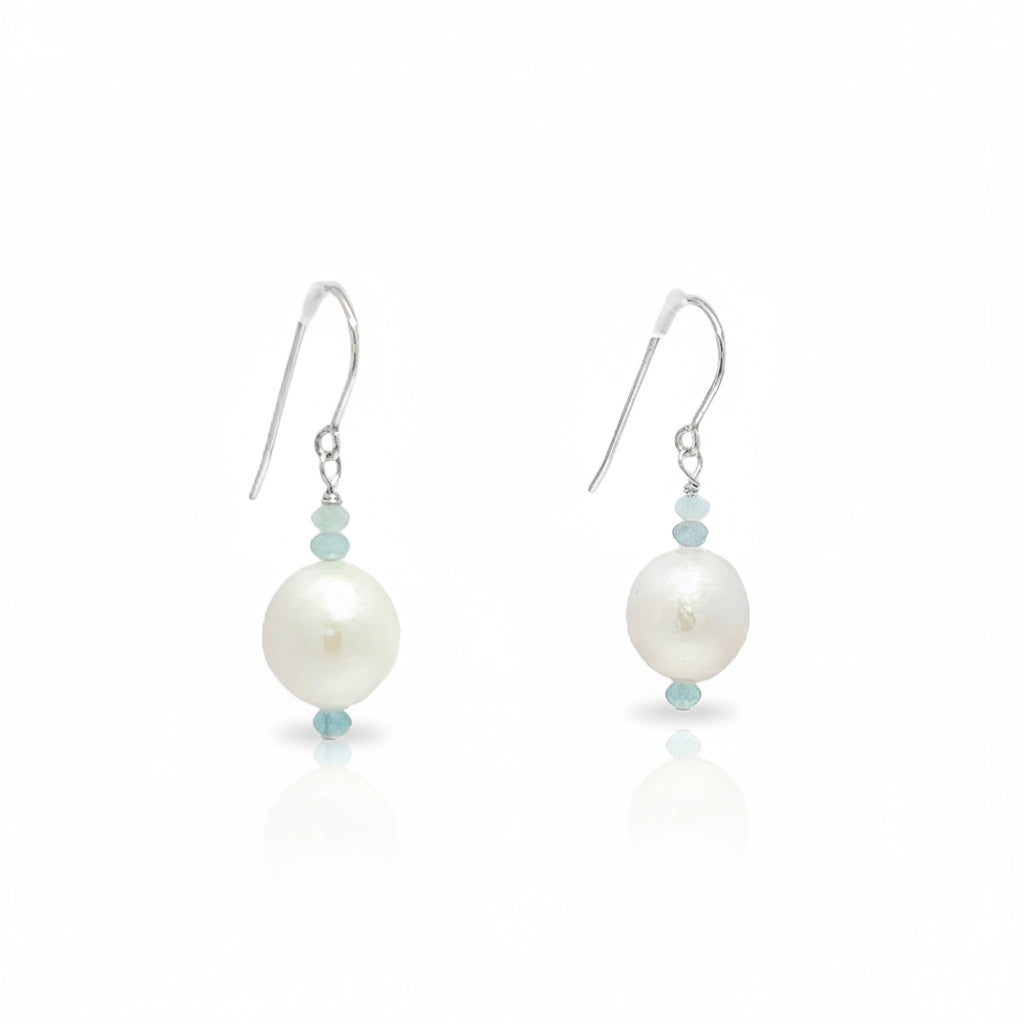Handmade on Cape Cod. Sterling silver earrings featuring gorgeous, shimmering large freshwater pearls and pale blue aquamarine faceted beads. Earrings measure approximately 1 inch from top of ear wire.