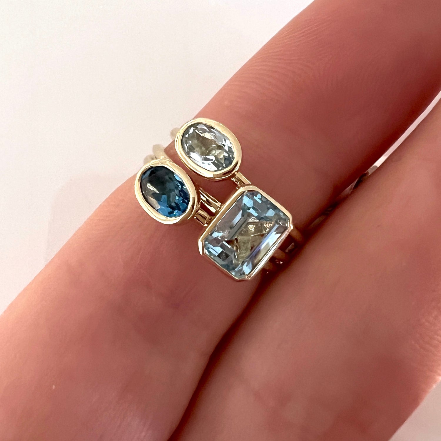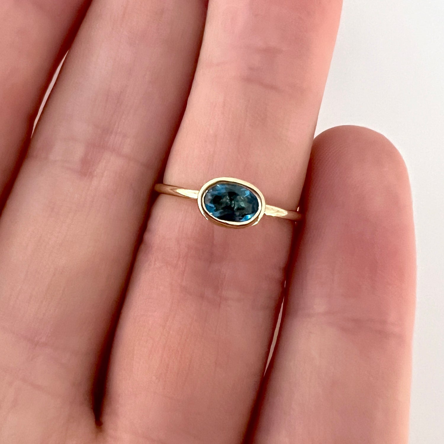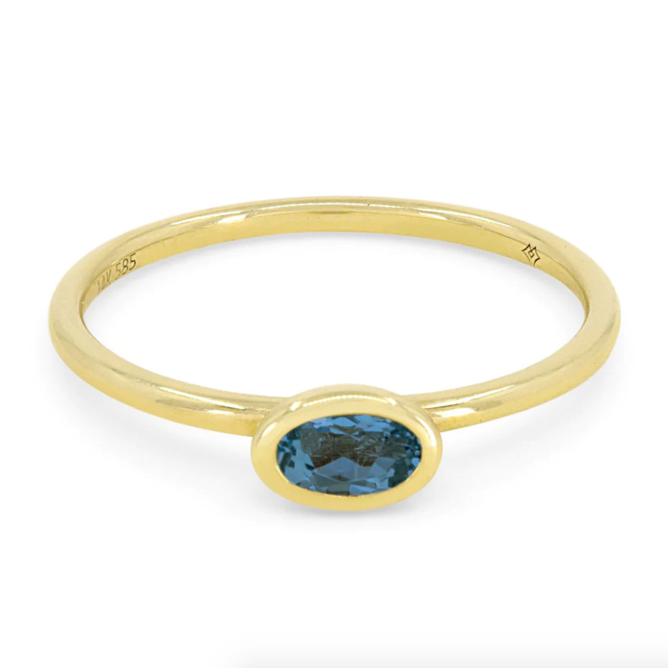 This ring features an oval cut London Blue Topaz bezel set in 14k gold. This ring looks great alone or stacked with your favorite rings for a fun layered look