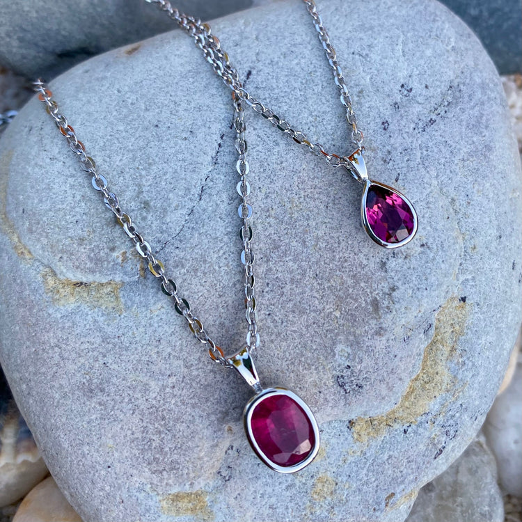Two vibrant pink tourmaline stones sparkle in these simple and elegant bezel set pendants.  Stones are set in sterling silver and hung from 18" silver cable chains.  Choose from smaller .74 carat teardrop pendant or larger 1.03 carat oval pendant.  Tourmaline is the birthstone for October.  Contact us for other length chains.