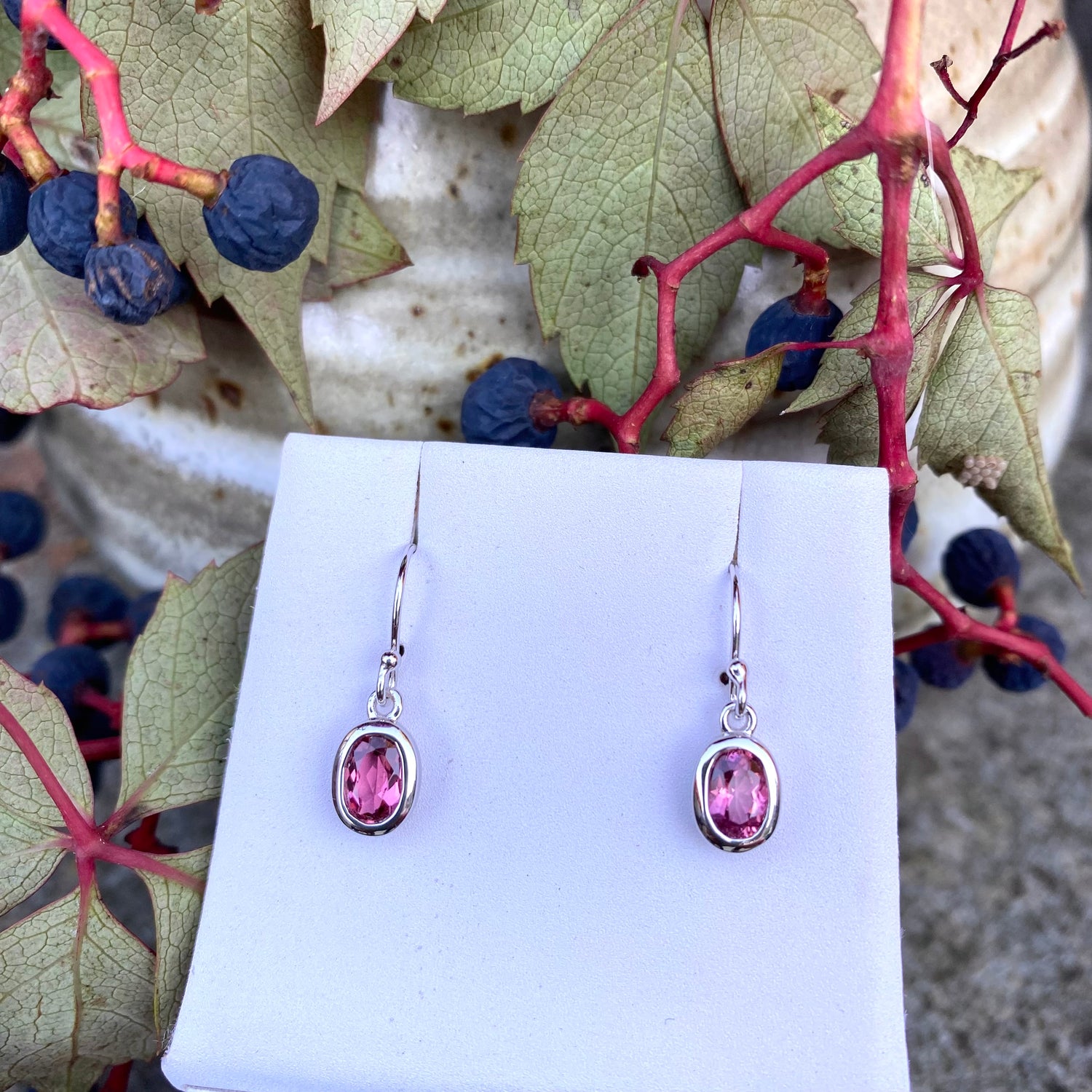Gorgeous gem quality pink tourmaline ovals are set into sterling silver bezel and hang delicately from silver ear wires. These stones are vibrant in color and sparkle in the light; total weight is .90 carats.