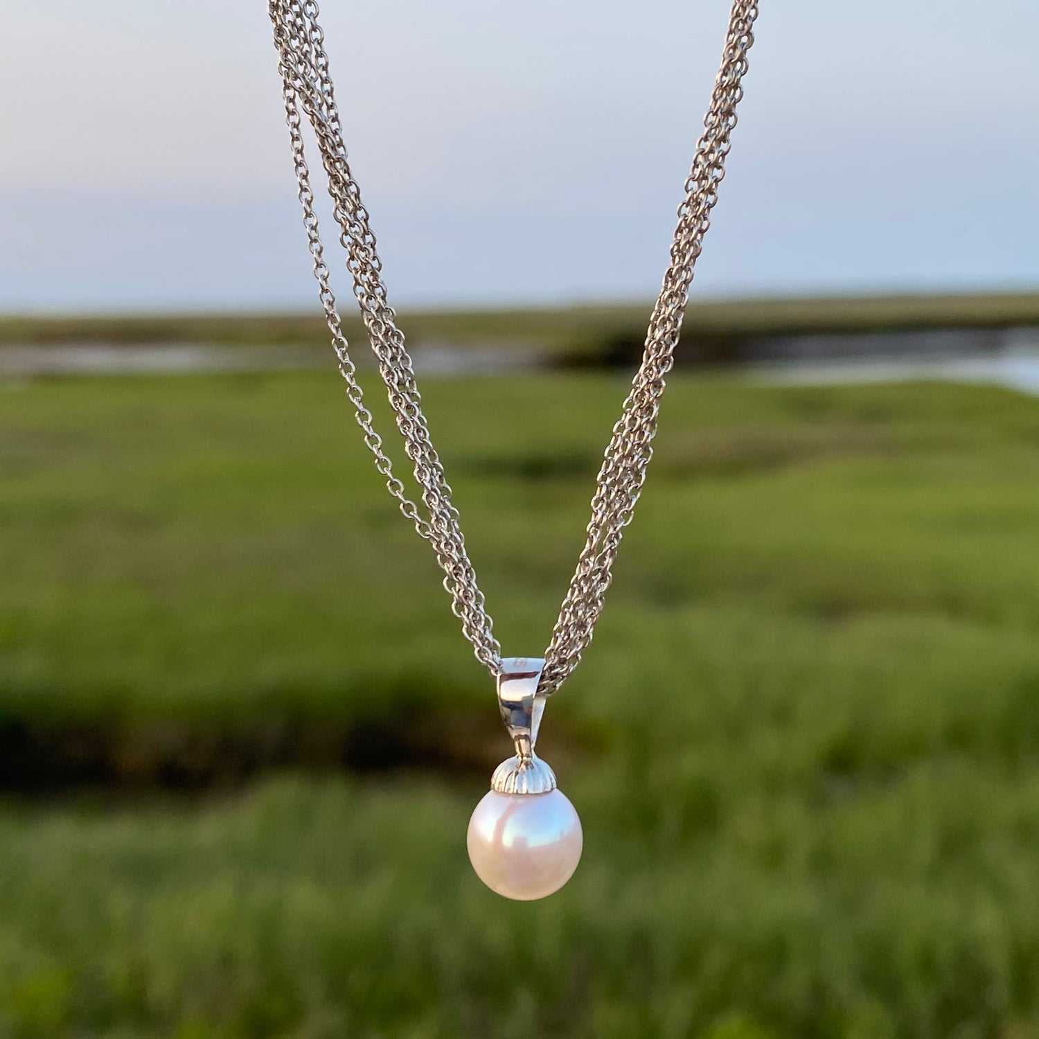 Sterling silver multi-chain necklace anchored by a stunning 9mm cultured freshwater pearl.  Necklace measures 16" in length.  Classic and timeless piece.  Silver is rhodium plated to keep metal from tarnishing.