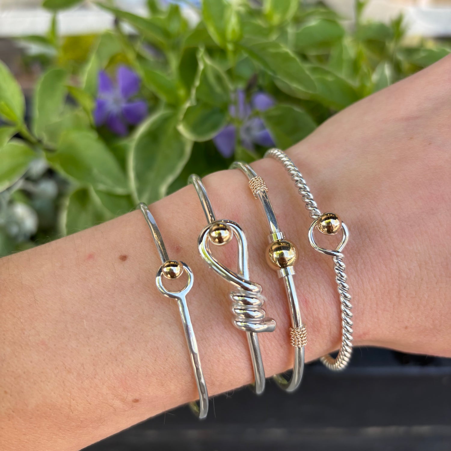 A beautiful compliment to the Cape Cod Jewelry collection, this is a fine twisted sterling silver bracelet with a loop hook closure around a solid 14k gold ball.