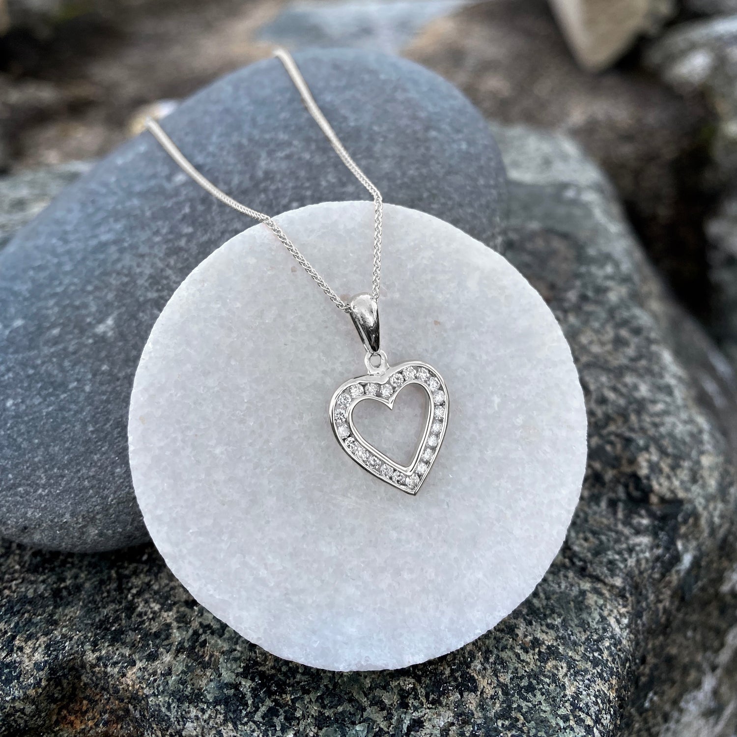 This classic heart shaped necklace is perfect for layering or wearing alone! This is a perfect gift for your loved one on Valentine's Day! Set in 14K White Gold with diamonds totaling .23 tcw. Pendant measures 1/2" in length.