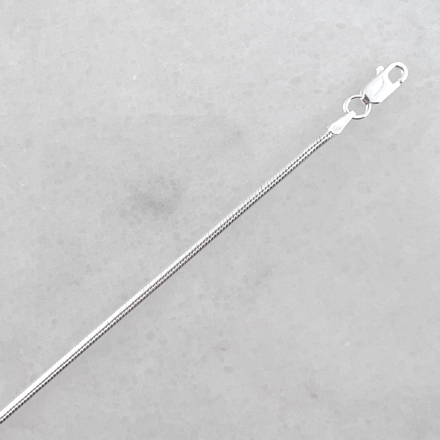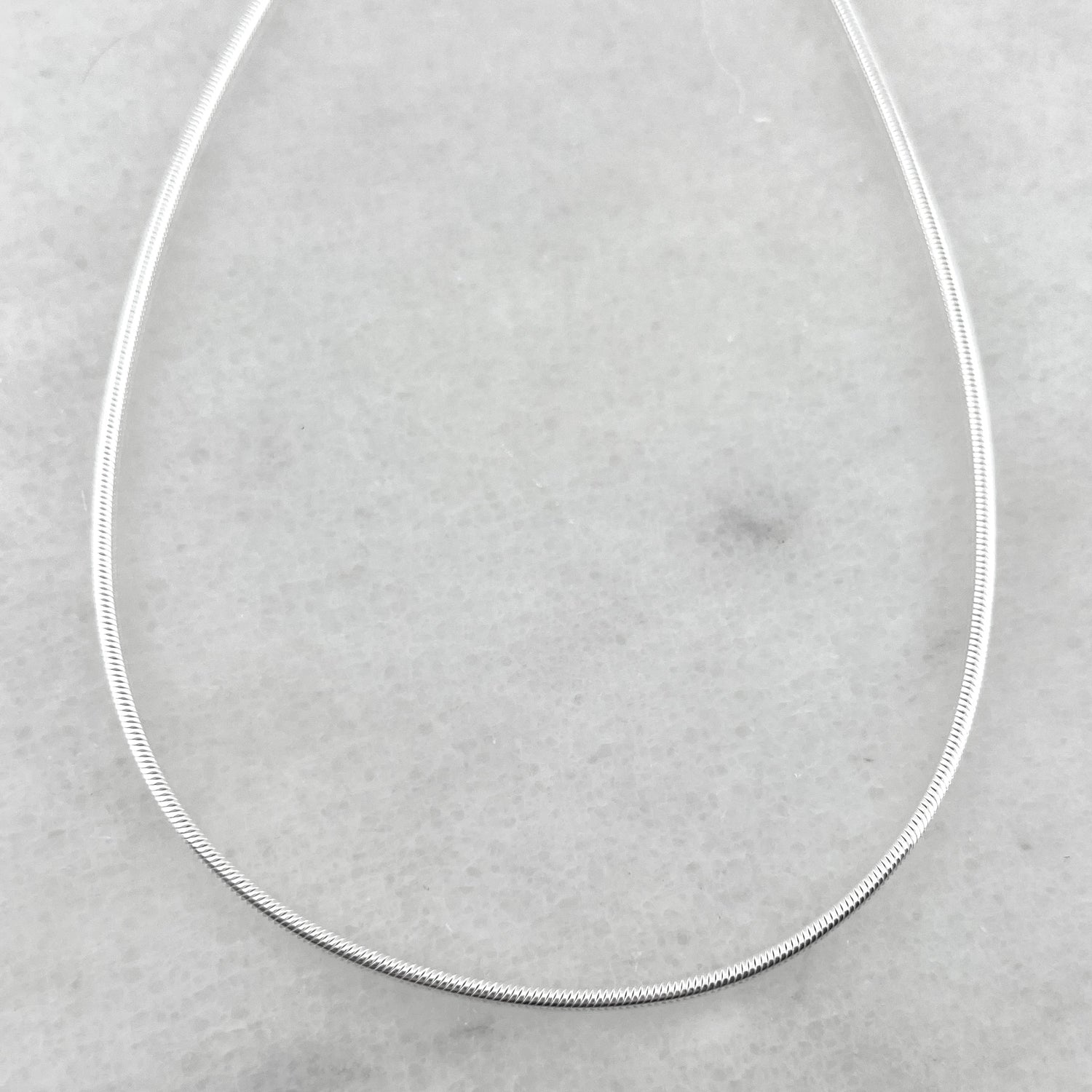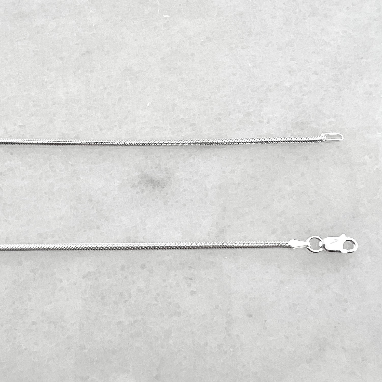A flexible sterling silver snake chain which features a sturdy lobster-claw clasp. Available in 16", 18", 20", 22" and 24".  Please call to order an all 14k gold necklace.