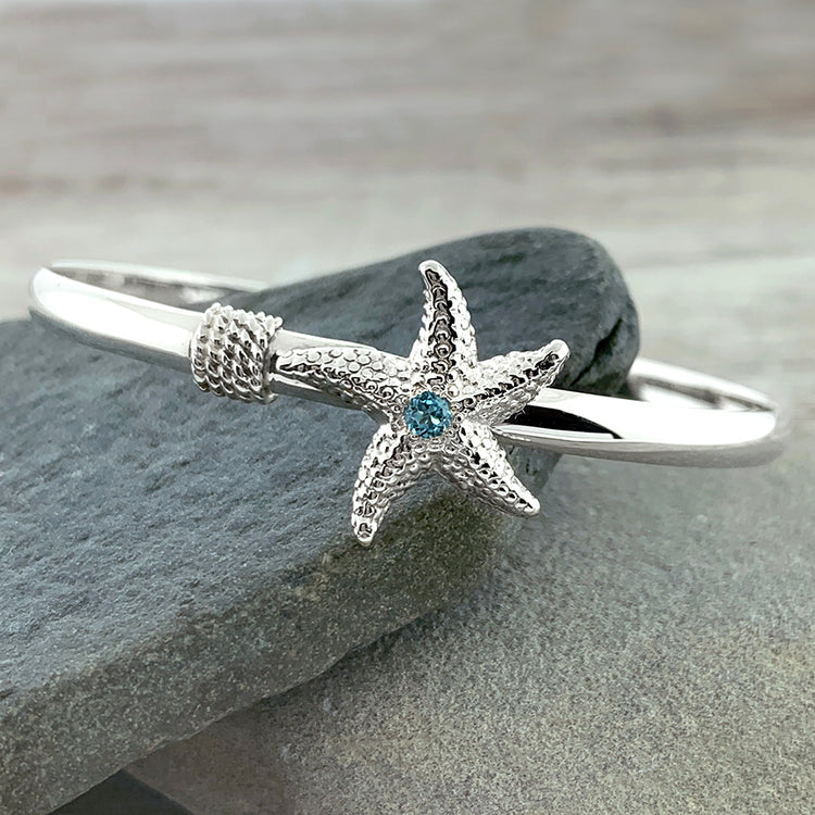 This sterling silver starfish bracelet features a shiny, textured finish with a brilliant blue topaz sparkling in the center. A hook is hidden behind the starfish so that it can be opened and put on over your wrist.