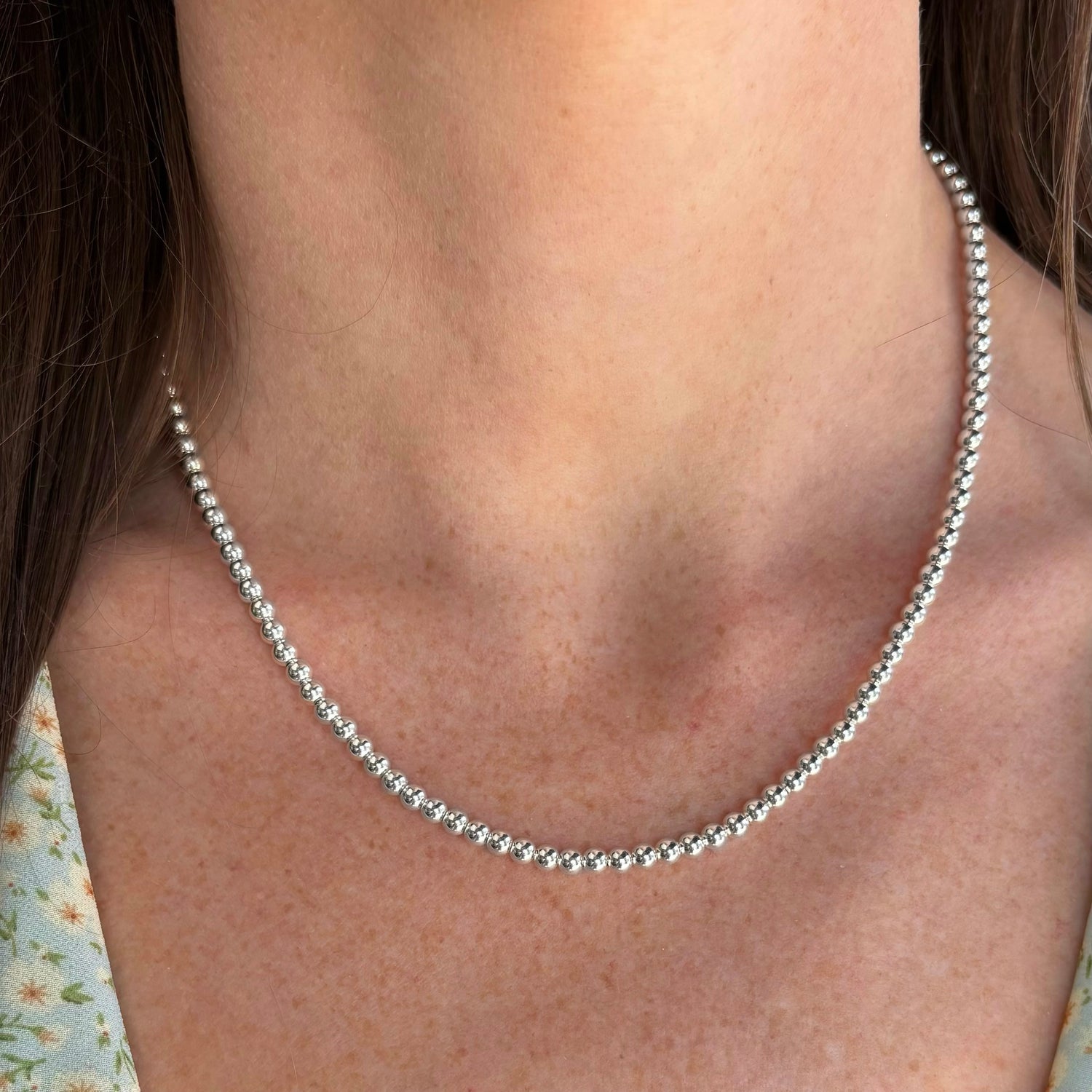 This distinctive necklace features bright sterling silver beads strung on a foundation chain. The result is a substantial chain with a highly tactile appeal. End is finished with lobster claw and is adjustable in length, from 16-18". The perfect addition to your collection and can be dressed up or dressed down!