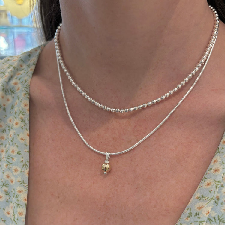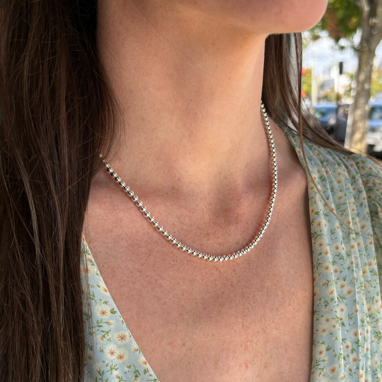 This distinctive necklace features bright sterling silver beads strung on a foundation chain. The result is a substantial chain with a highly tactile appeal. End is finished with lobster claw and is adjustable in length, from 16-18". The perfect addition to your collection and can be dressed up or dressed down!