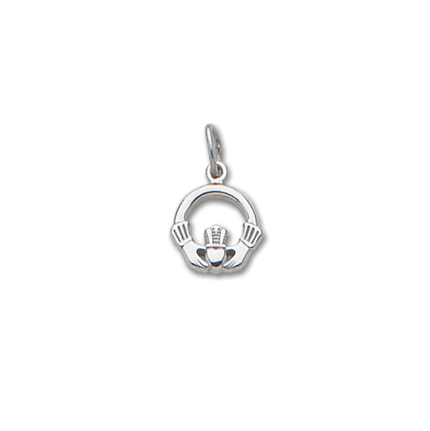 This sterling silver charm is perfect to be used as a necklace or charm bracelet. The small sterling silver claddagh measures 1/2" and the medium measures 5/8"