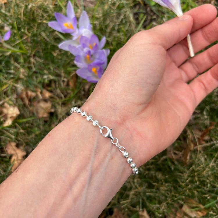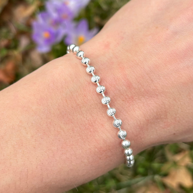 This fun bracelet is made up of 4mm sterling silver round beads, with a special crescent moon shape cut in the metal that creates a beautiful sparkle. Finished with rhodium plating to prevent tarnish and a sterling silver lobster claw clasp.