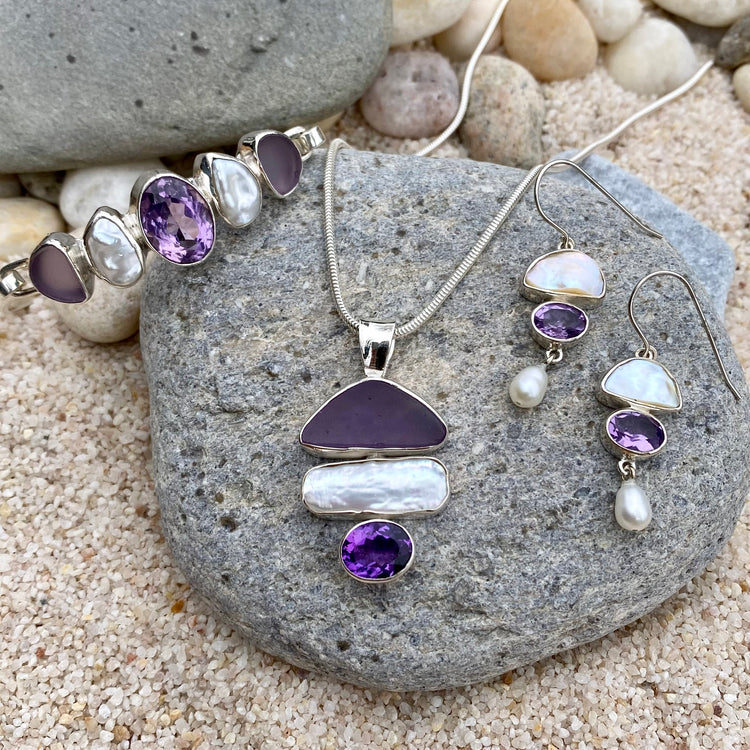 Sterling Silver Pearl + Amethyst Drop Earrings