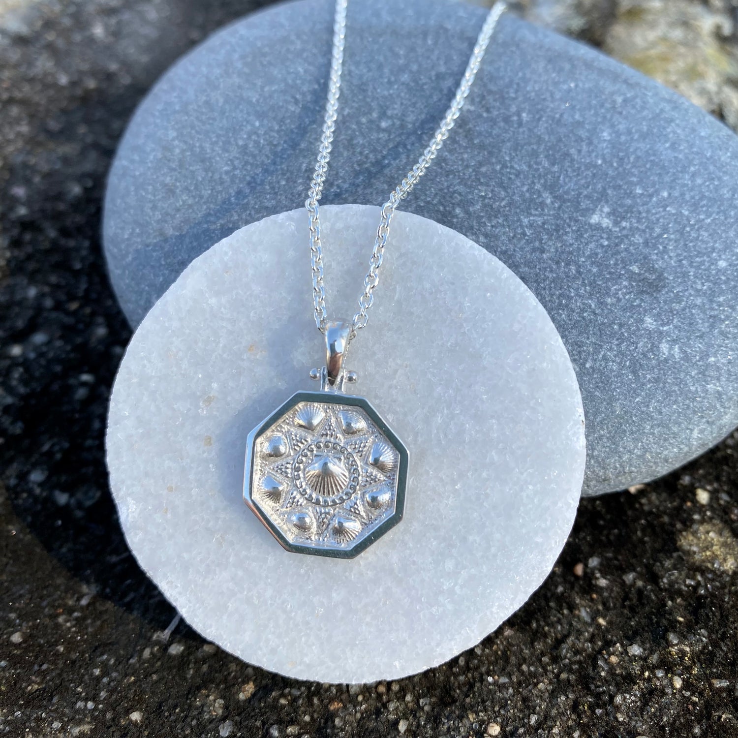 This all Sterling Silver necklace features the classic Sailor's Valentine Charm decorated with scallop shells. This pendant measures 5/8" across.