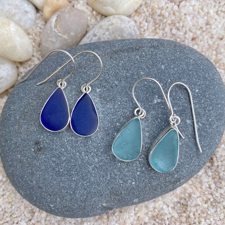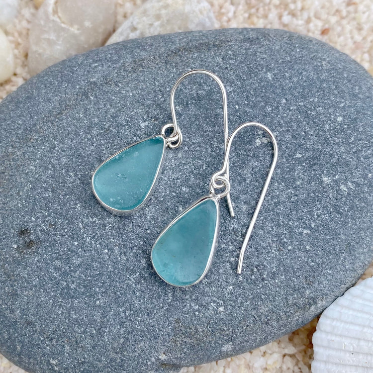 These beautiful drop earrings, designed by Misti Martin, features a teardrop shaped natural sea glass set in sterling silver with a wire post.