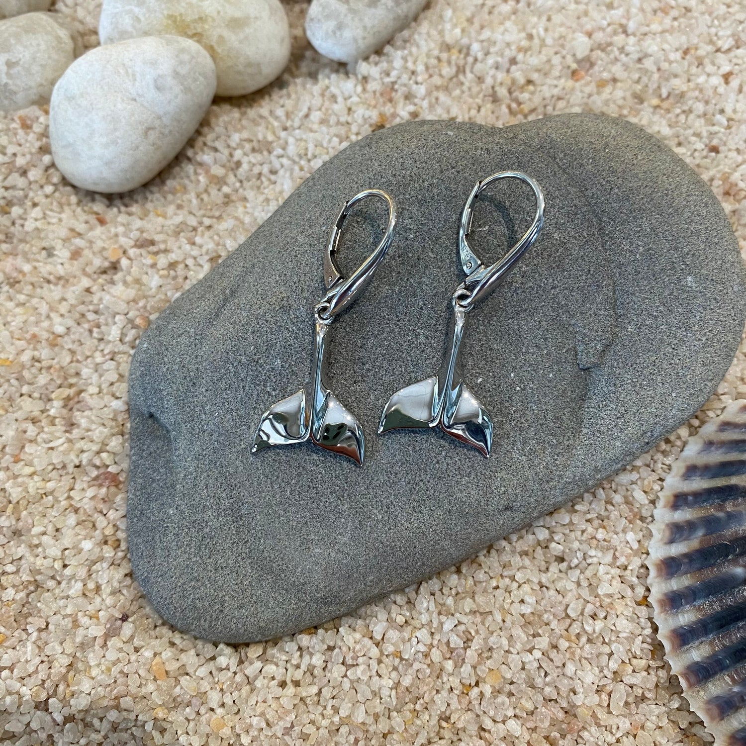 These polished whale tail drop earrings are available in sterling silver or solid 14k gold. Sterling silver earrings feature a lever back while the solid 14k gold earrings feature a fish hook post.