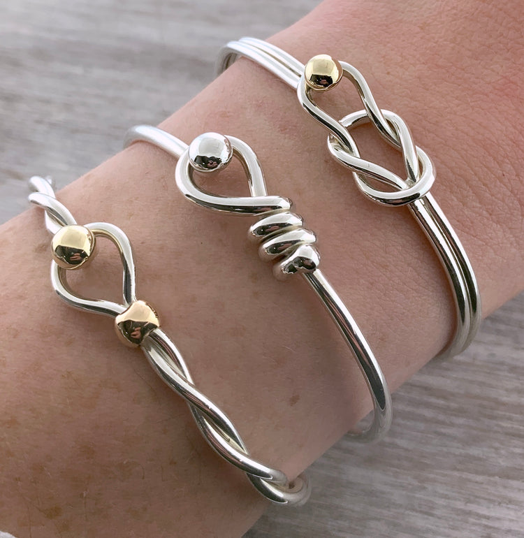 Two pieces of Sterling Silver are twisted and fused together to create the twisted sandbar bracelet. The band hooks onto a solid 14K Gold ball and a solid 14K Gold wrap on the side beautifully finishes the bracelet.