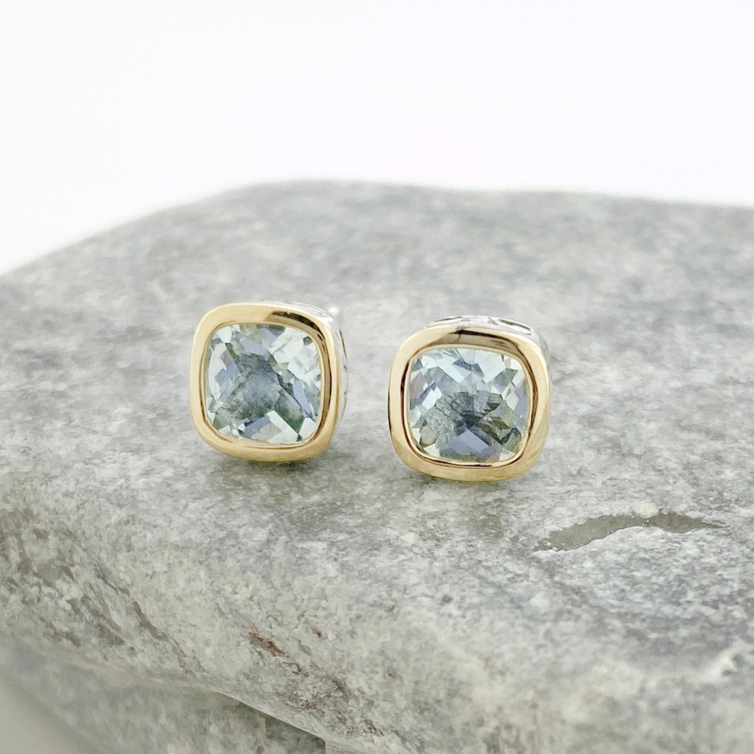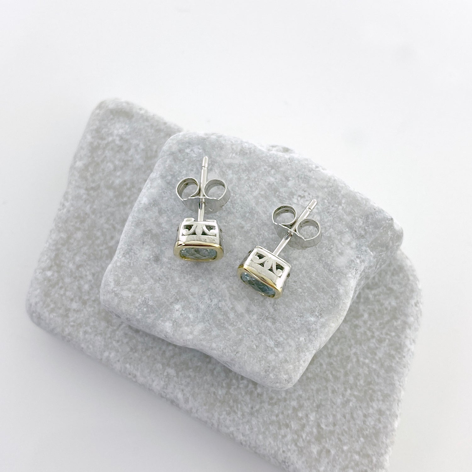 These simplistic sterling silver stud earrings feature a cushion cut aquamarine bezel set in sterling silver, surrounded by a layer of 14k gold.