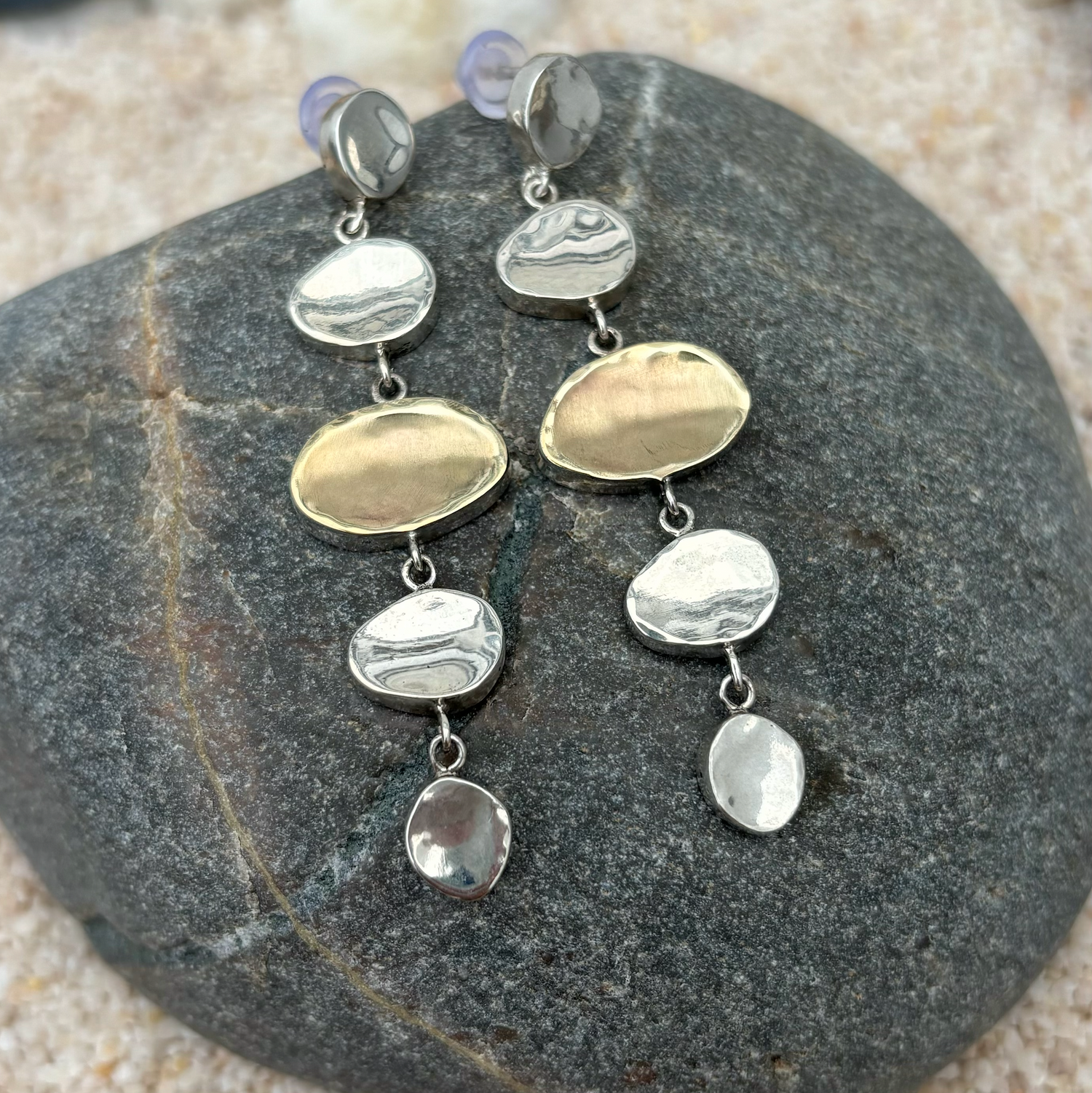 These earrings are a perfect addition to our Beach Stone Collection. Crafted in 9K gold and sterling silver, these earrings feature polished organically shaped "stones" dangling, resembling a cairn. Cairns are stacks of rocks on top of each other, balancing perfectly and bringing a sense of zen.