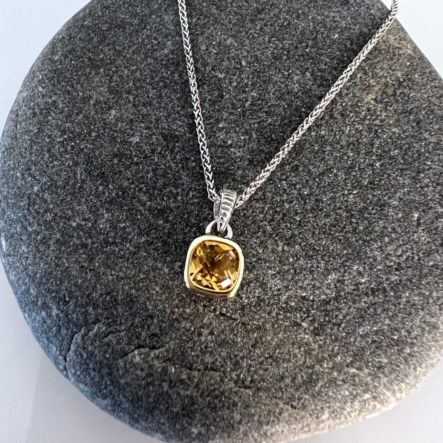 This simplistic sterling silver necklace features a cushion cut citrine bezel set and surrounded by a layer of 14k gold.