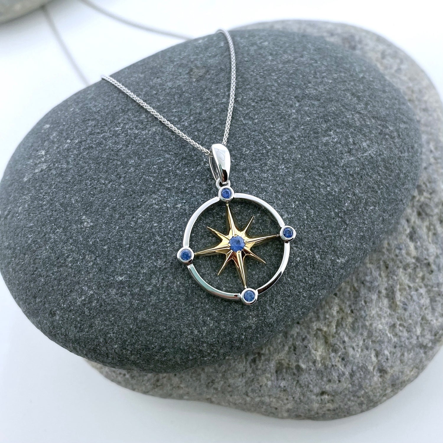 14k white and yellow gold compass rose pendant, accented with 5 gorgeous blue sapphires at the center and cardinal points.