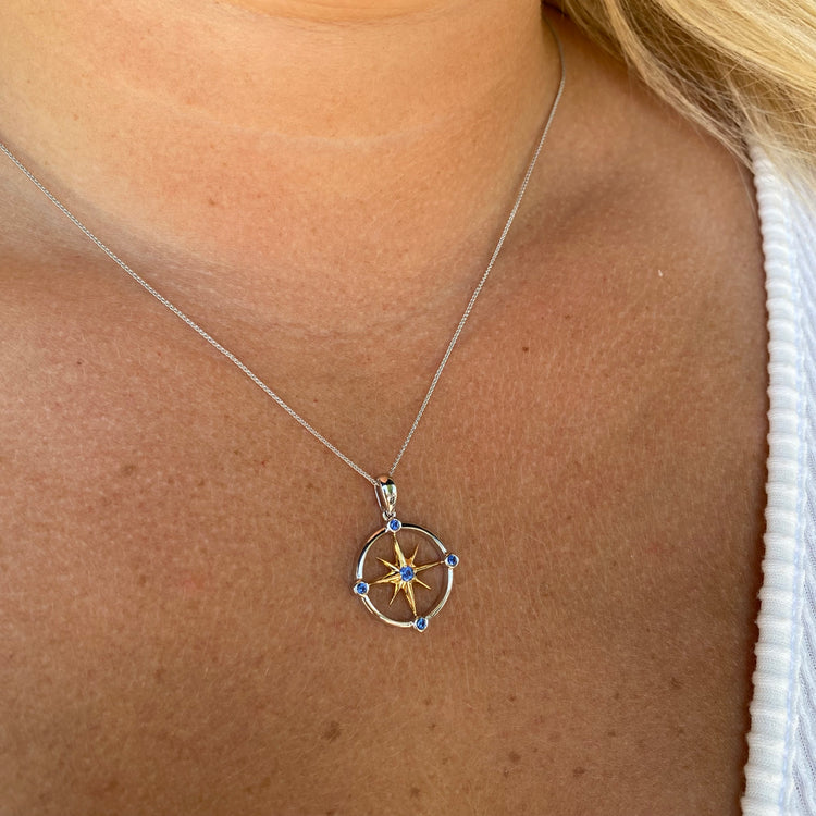 14k white and yellow gold compass rose pendant, accented with 5 gorgeous blue sapphires at the center and cardinal points.