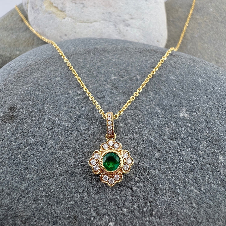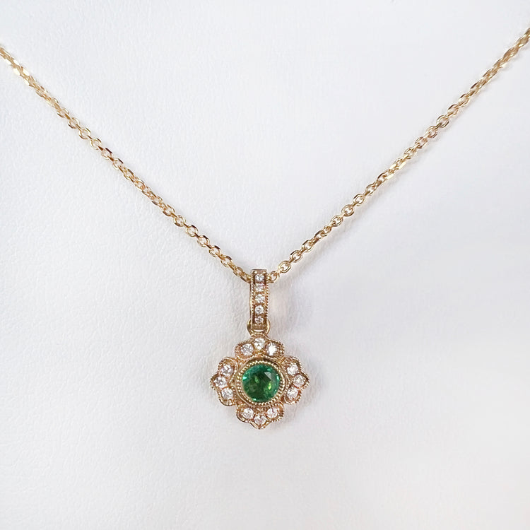 This vintage inspired necklace features a vibrant emerald adorned with glistening diamonds. Set in 14k yellow gold, the emerald measures .23 ct and diamonds total .08 tcw.