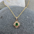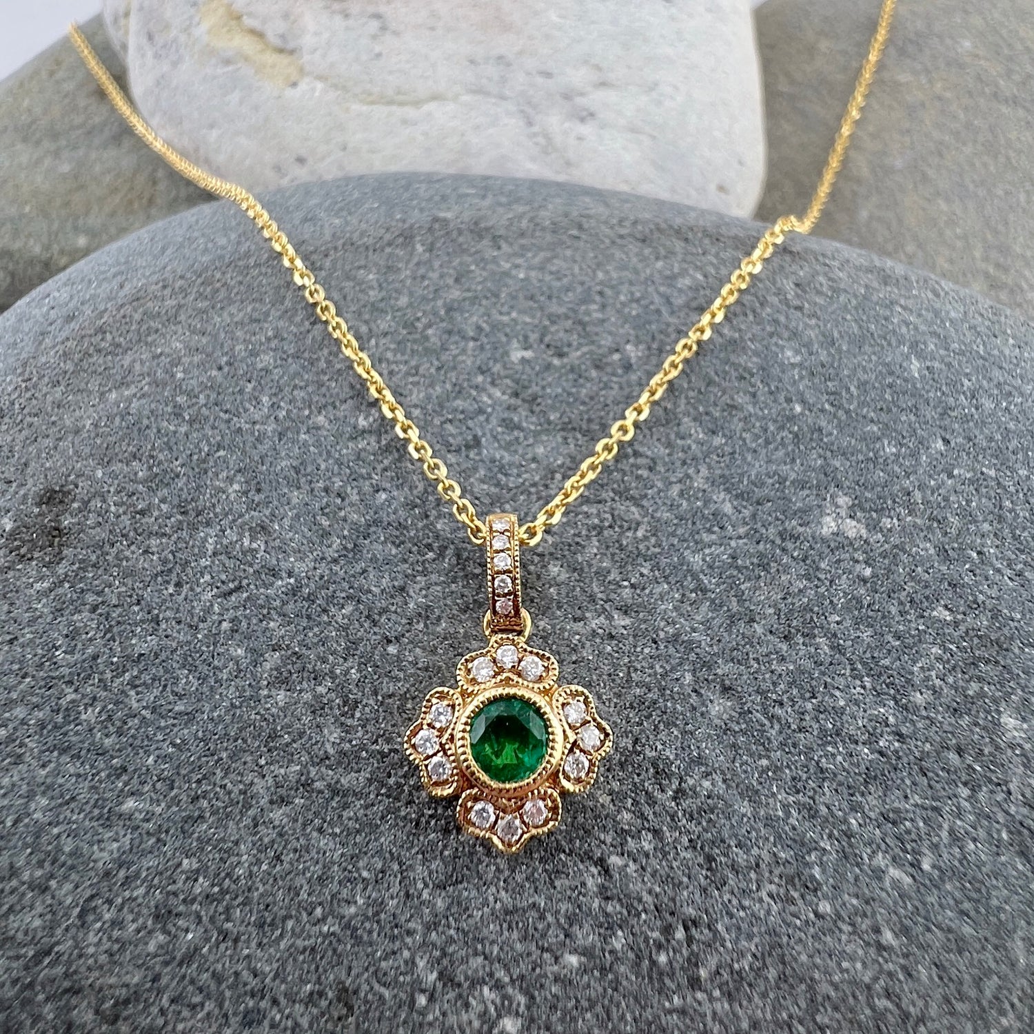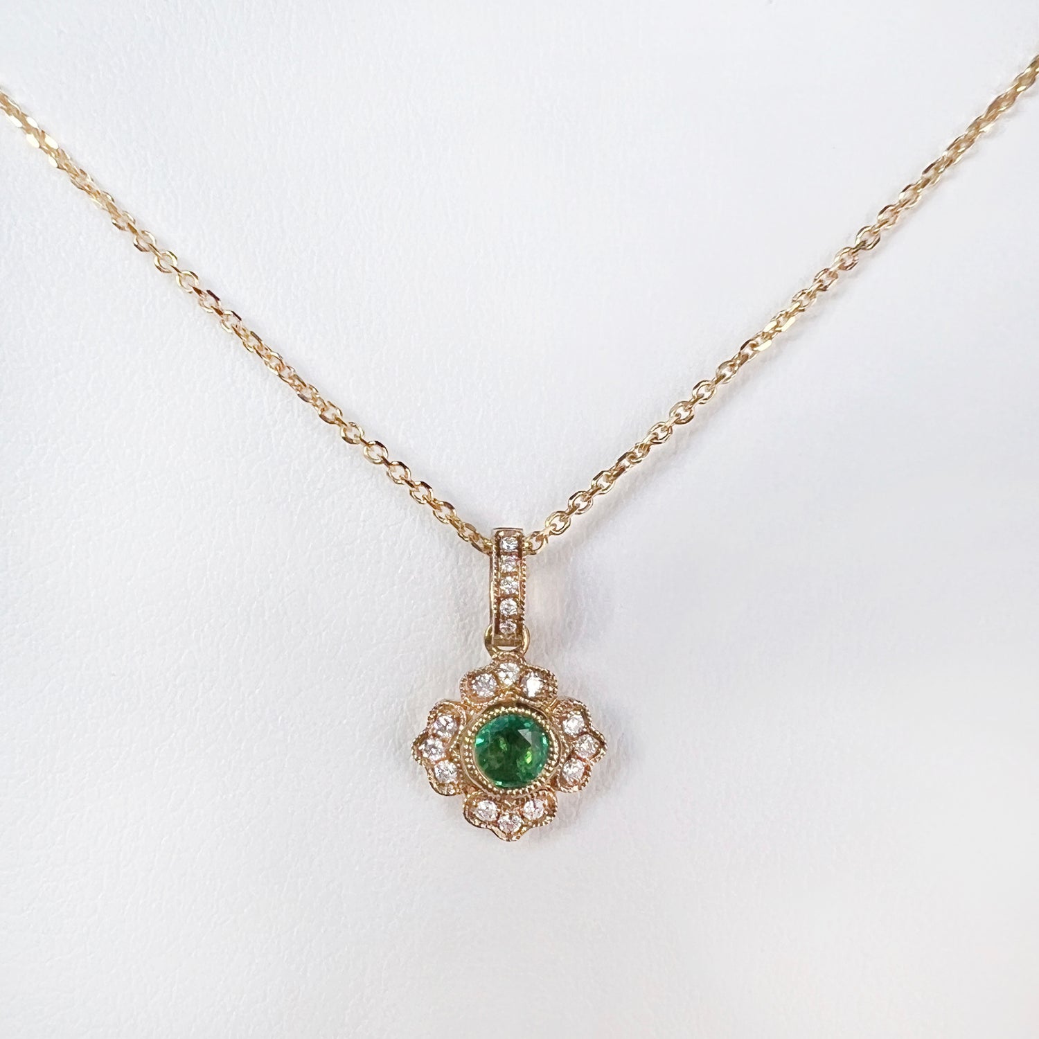 This vintage inspired necklace features a vibrant emerald adorned with glistening diamonds. Set in 14k yellow gold, the emerald measures .23 ct and diamonds total .08 tcw.
